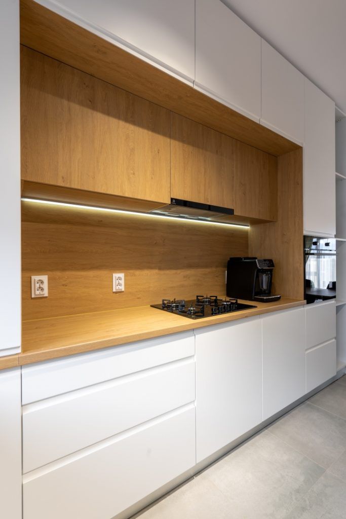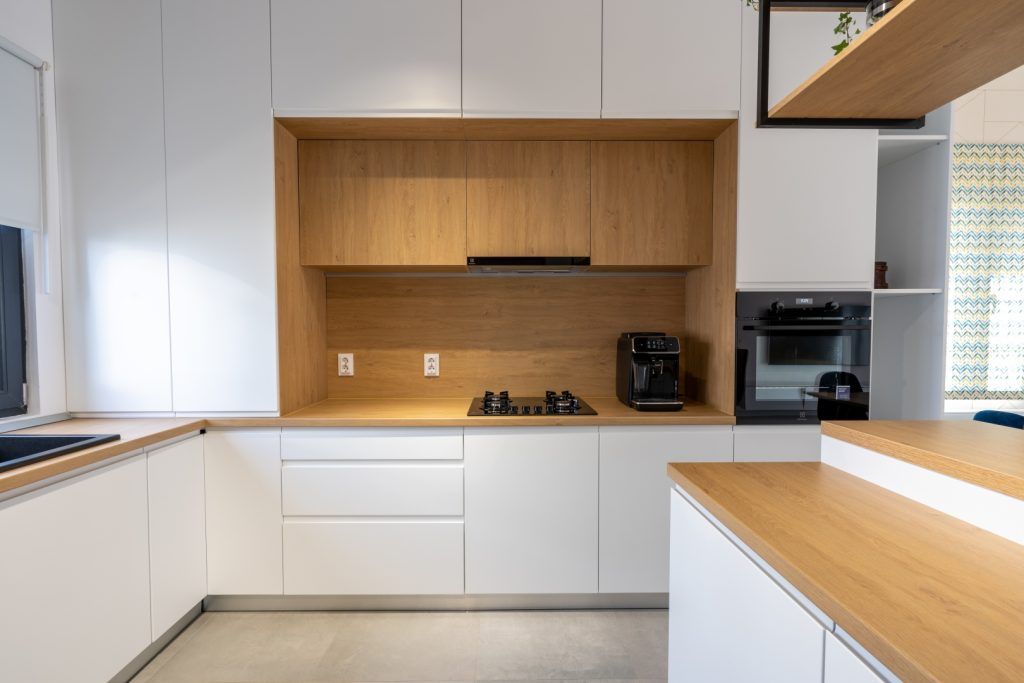 Bucataria spatioasa este o zona simpla si curata, gandita in linii drepte, cu accentul pus pe functionalitate si pe pastrarea imaginii stilistice de ansamblu a casei. “Fiind open space cu zona de living, am optat pentru o combinatie de alb si lemn, cu accente de negru, care sa nu concureze cu accentele de culoare din restul casei. Toata mobila a fost realizata la comanda.”