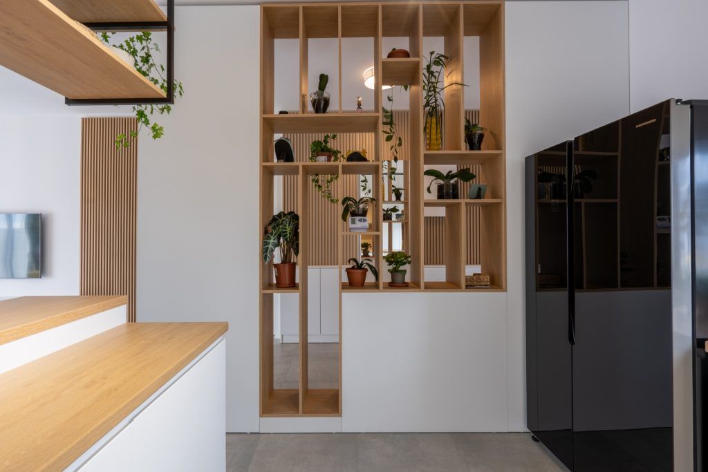 Holul este delimitat de bucatarie printr-un corp de mobilier cu rafturi alternante: deschise si zone inchise pentru a masca anumite depozitari. Acest ansamblu de mobilier are un rol functional important in orice locuinta si unul estetic, integrat armonios in conceptul general.