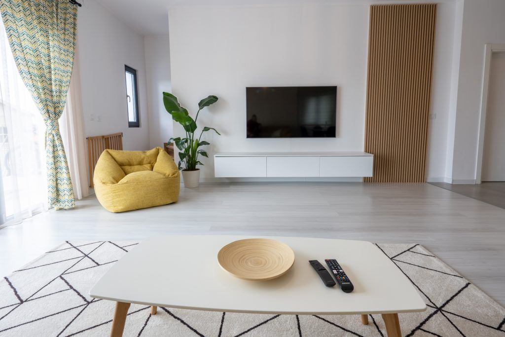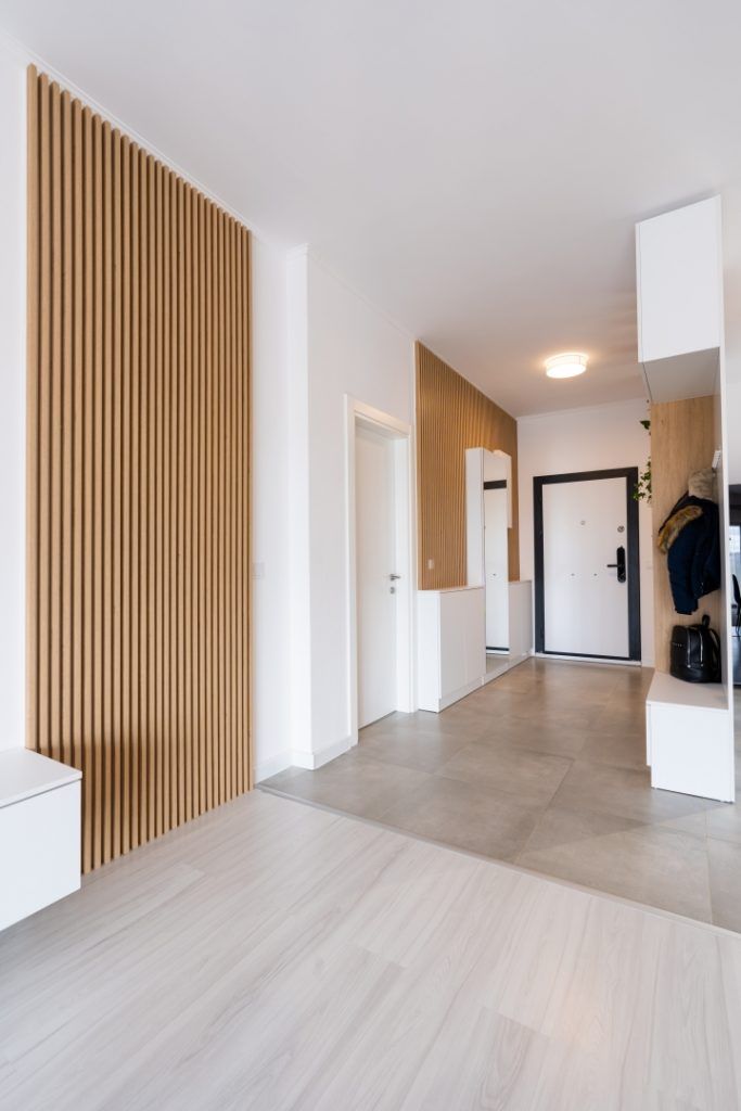Locuinta a fost preluata de la dezvoltator cu finisaje la gri; designerii au optat pentru a incalzi totul cu nuante de lemn si accente de culori primare, saturate.