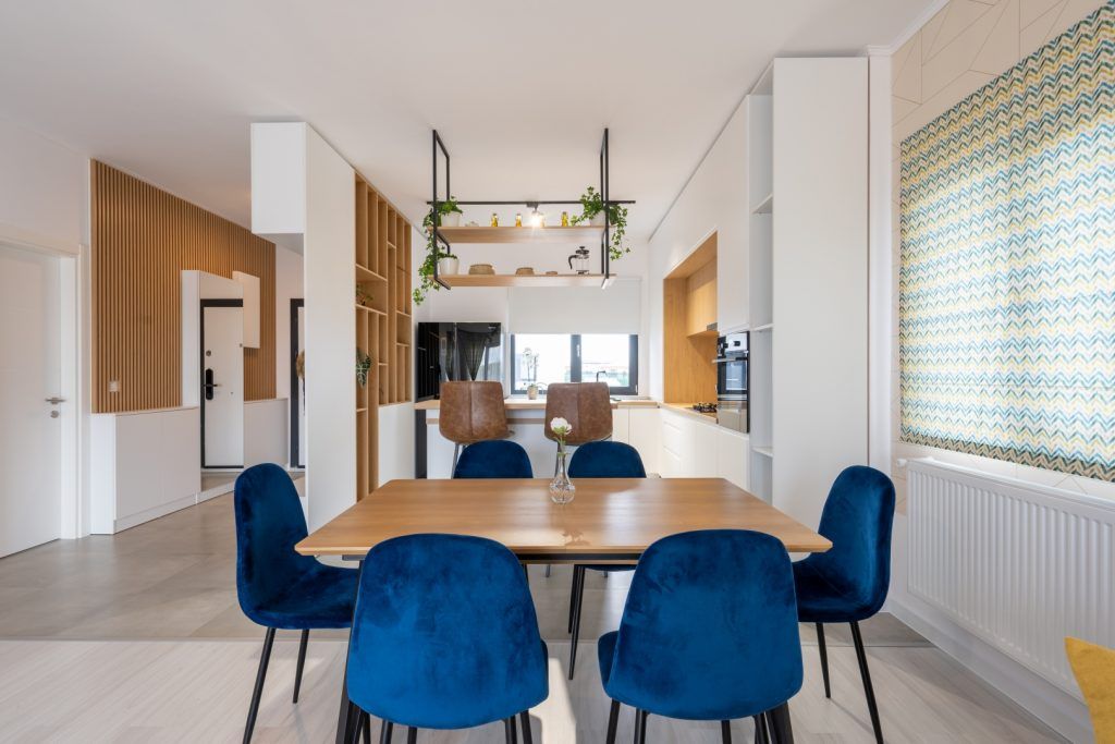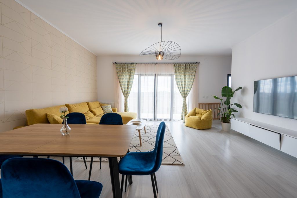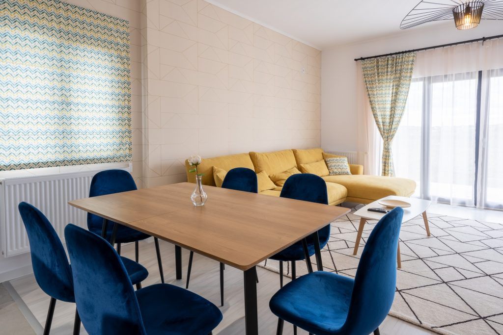 Regasim astfel scaunele tapitate intr-o nuanta de albastru puternic si canapeaua galbena din living. Aceasta imagine este intregita de un decor cu modele geometrice ( perdele, covor, tapet).