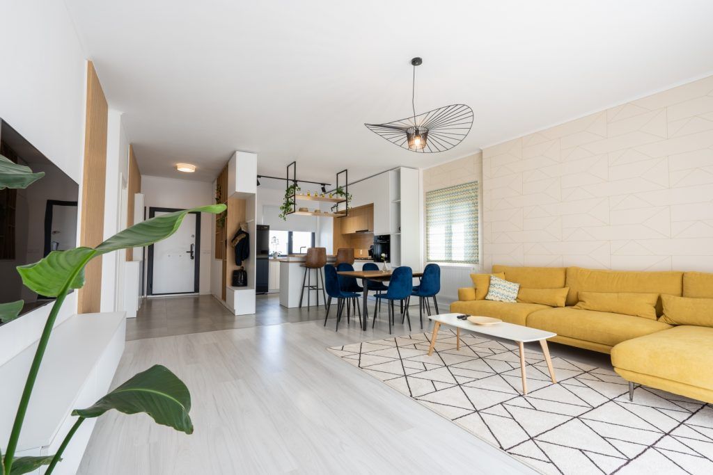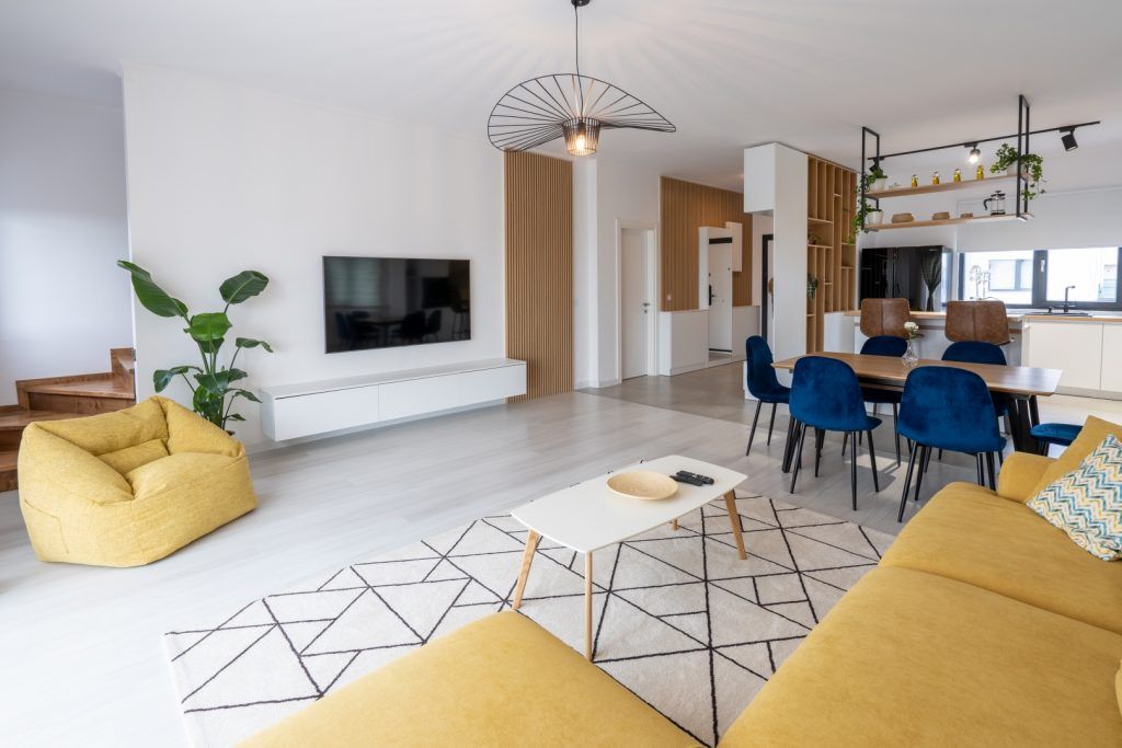 Deschide GaleriaClientii, un cuplu tanar (care a trecut recent de la apartament la casa), si-au dorit o amenajare luminoasa, calda, cu accente de culoare si o zonifcare atent studiata pentru a delimita bine zonele intre ele.