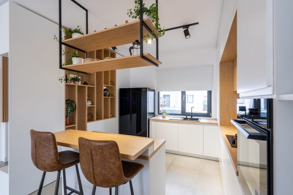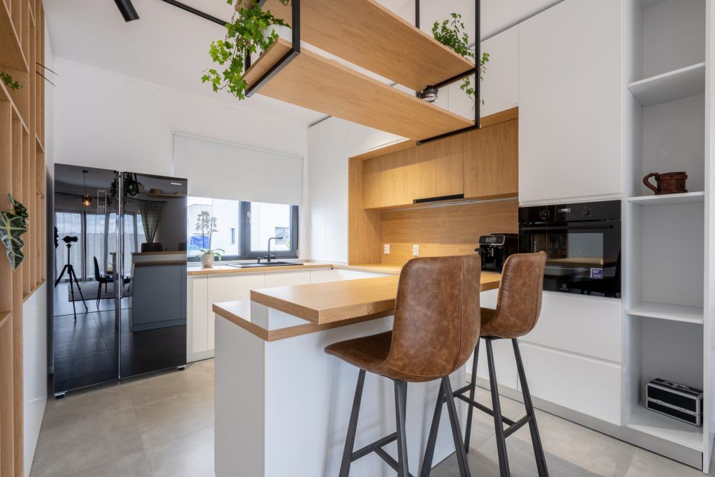 O insula de bar delimiteaza zona de dining de bucatarie, o solutie extrem de practica si eleganta. Avand rafturi de lemn si metal suspendate deasupra ei, si o pozitionare avantajoasa in cadrul zonei de zi, insula este ca un magnet de atractie pentru gatitul impreuna in familie sau cu invitatii la cina.