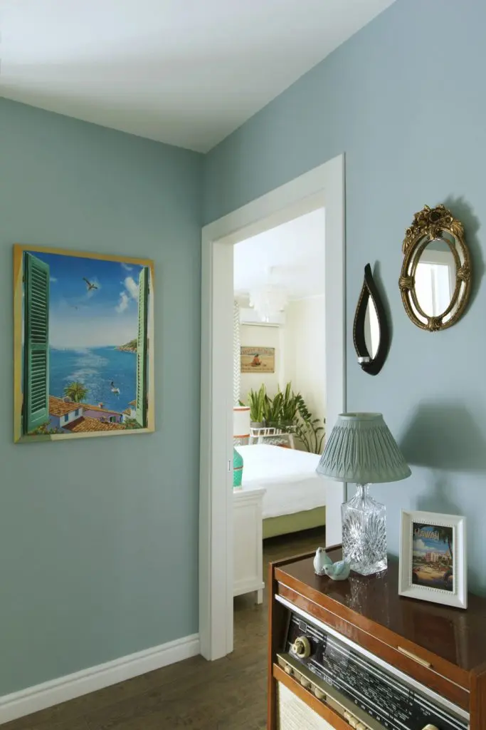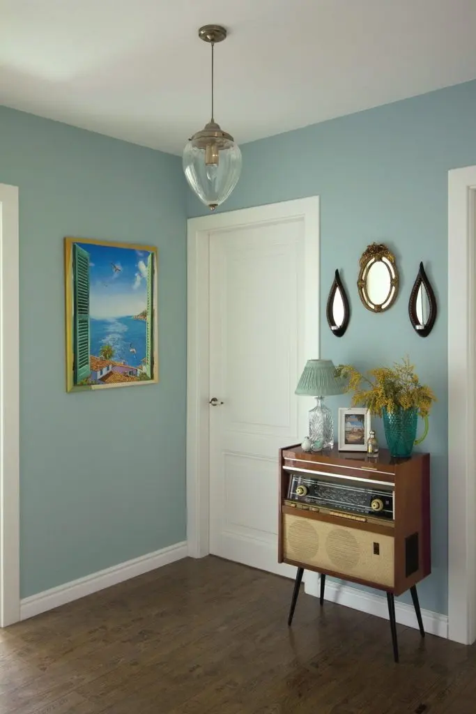 Tematica marina o regasim si pe hol, excelent redata printr-un albastru-turcoaz si alb, alaturi de un tablou desprins din povestile de vacanta. Radioul vechi pe care cei 2 au ales sa-l pastreze are o valoare sentimentala, de aceea si locul ales.