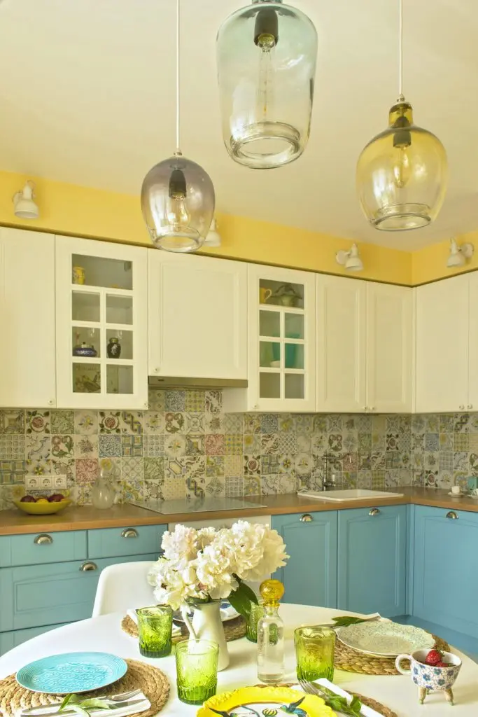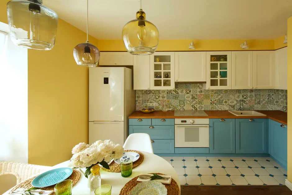 Galbenul imprima caldura acestei camere, iar albastrul mobilierului principal de bucatarie alaturi de albul dulapurilor transmite o stare de bine, de confort si relaxare.