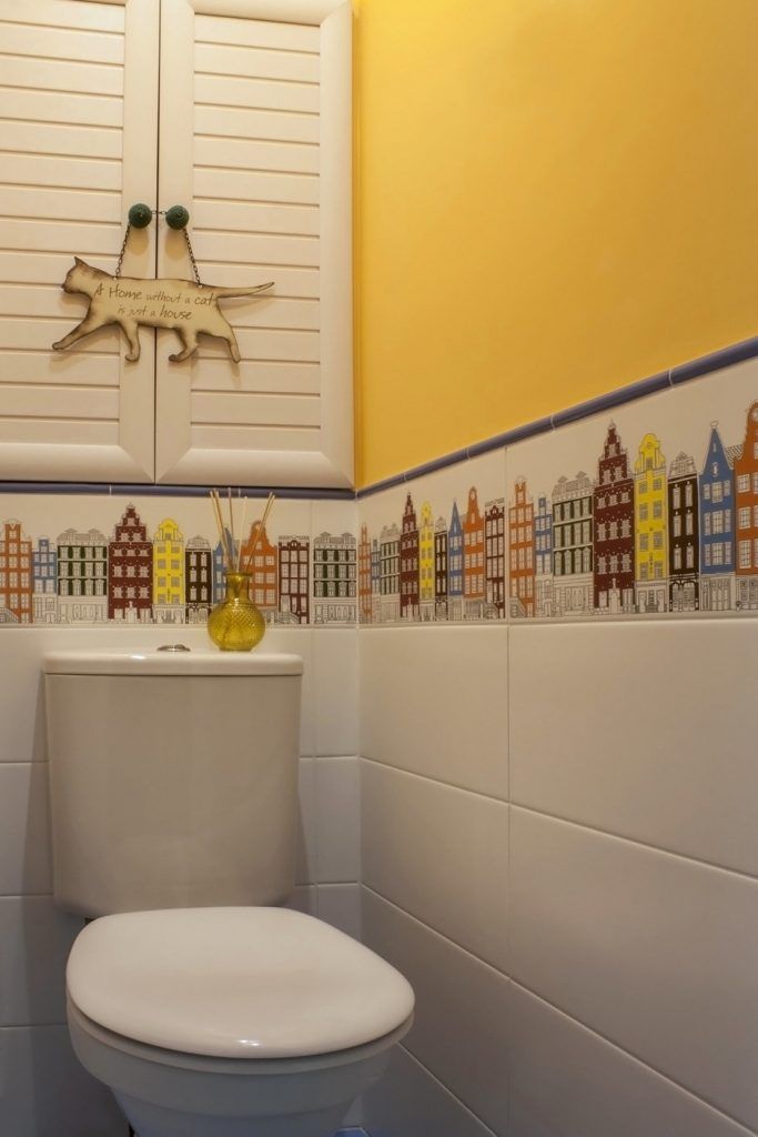 Baia cu toaleta sau wc-ul de serviciu decorat cu galben pentru a spori senzatia de spatiu.