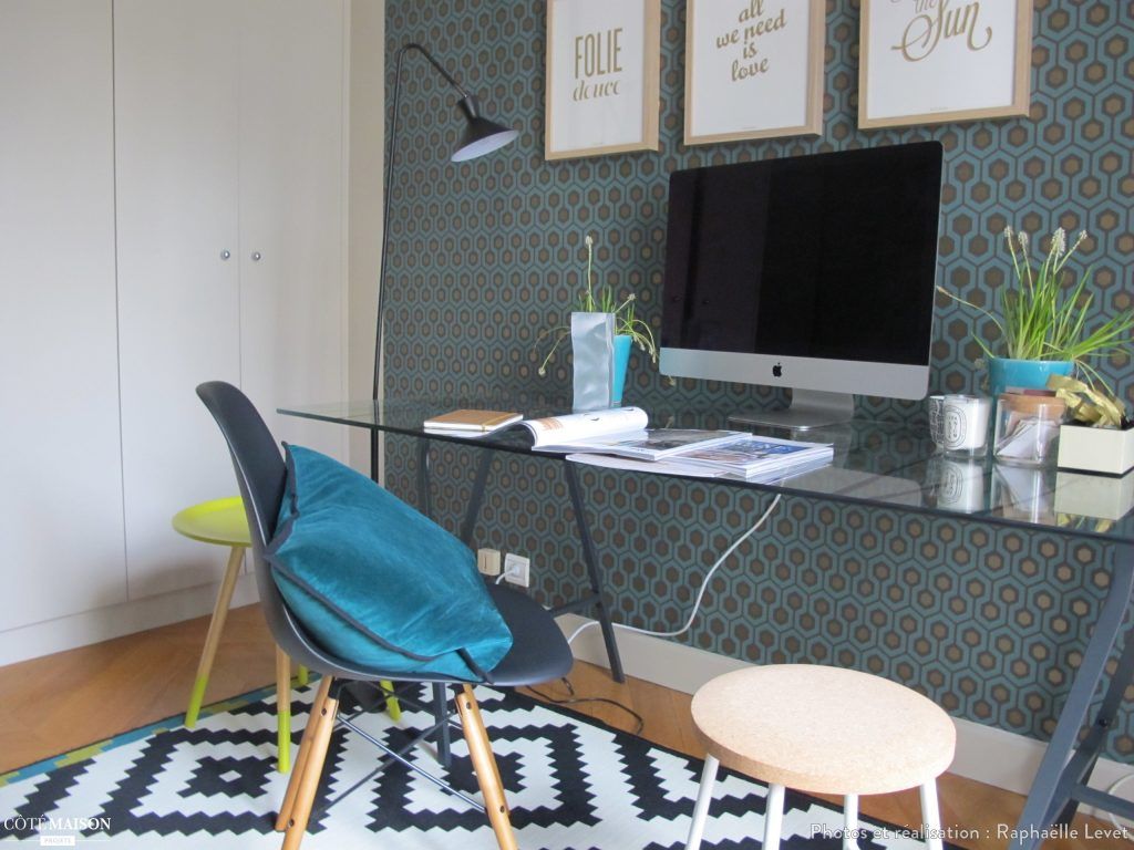 Aceasta amenajare pare locul ideal pentru lucra de acasa: o masa foarte comoda de sticla, dar nu exagerat de comoda incat sa poti adormi cu capul pe ea inaintea respectarii deadline-urilor importante, un perete accent cu un model de tapet foarte vesel, spatii de depozitare suficiente, doua tablouri cu mesaje motivationale care nu te lasa sa uiti ideile importante, plante pentru purificarea aerului si o lampa care sa lumineze tastatura sau cartile de pe birou.
