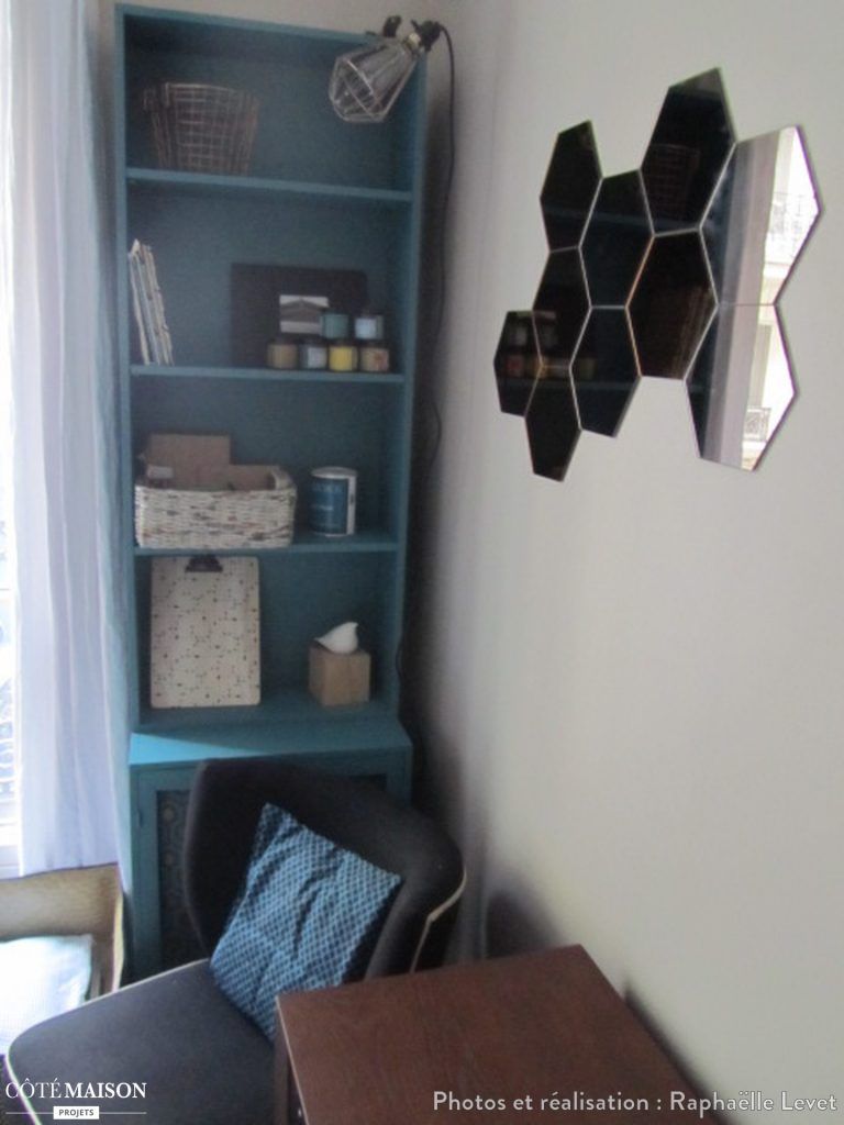 In restul camerei mai putem vedea cateva rafuri si scaune, iar pe unul din pereti se afla o oglinda decorativa sub forma de fagure. Se pare ca plantele au un rol destul de important in aceasta amenajare. Nuanta frunzelor se potriveste foarte bine atat cu vernilul care acopera rafturile de carti dar si cu nunta metalica a dulapului.