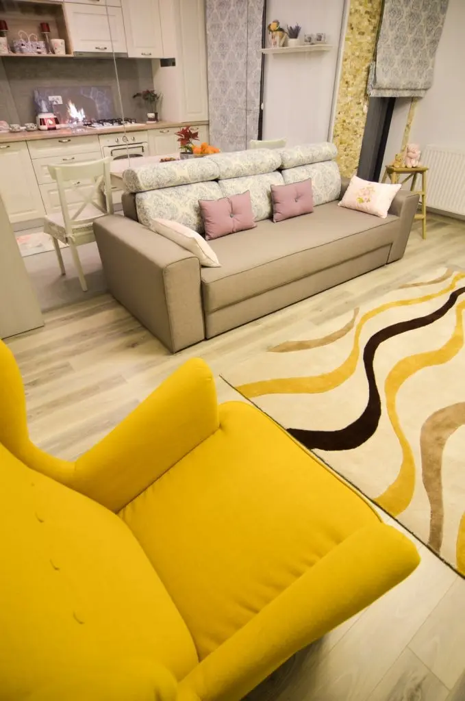 Decoratiunile si accentele de culoare reusesc sa defineasca spatiul intr-un mod foarte placut. Galbenul fotoliului, tabloul colorat, imprimeurile draperiilor si covoraselor contureaza o amenajare in tonuri feminine, calde, delicate si primitoare.