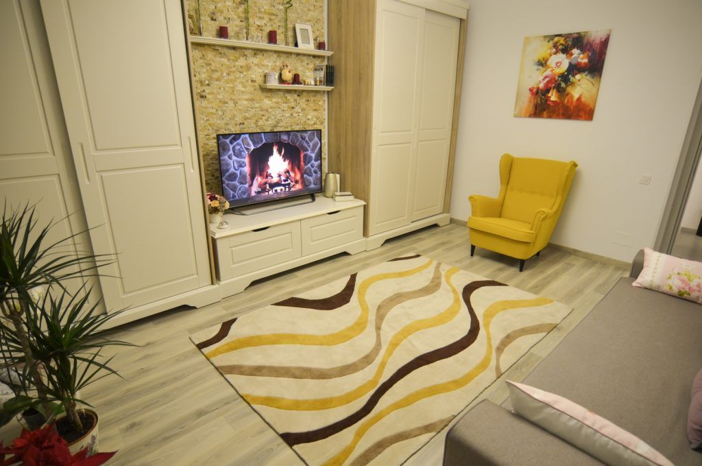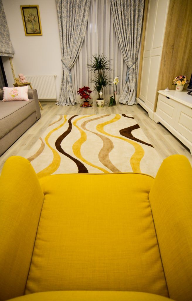 Decoratiunile si accentele de culoare reusesc sa defineasca spatiul intr-un mod foarte placut. Galbenul fotoliului, tabloul colorat, imprimeurile draperiilor si covoraselor contureaza o amenajare in tonuri feminine, calde, delicate si primitoare.