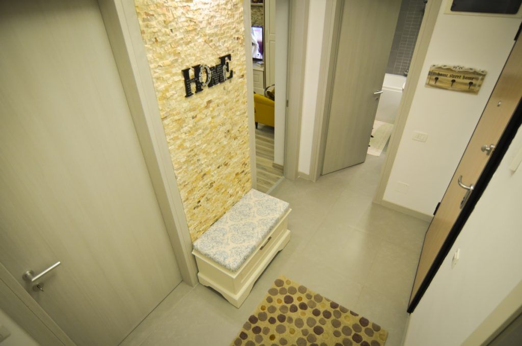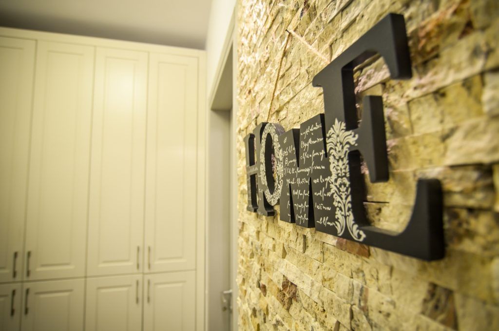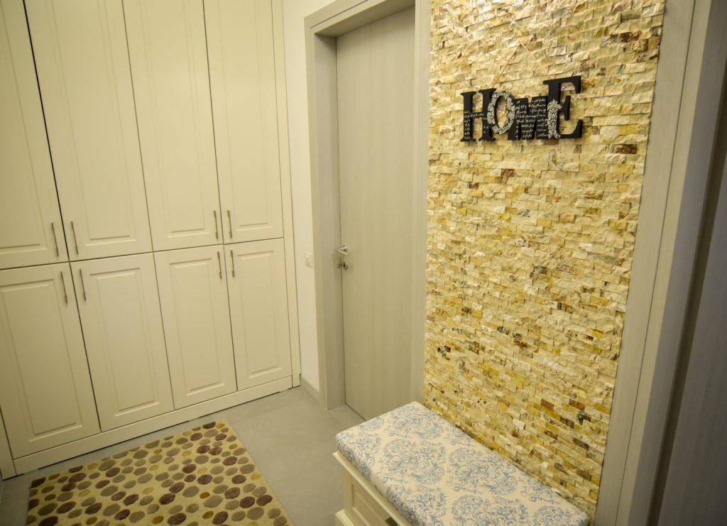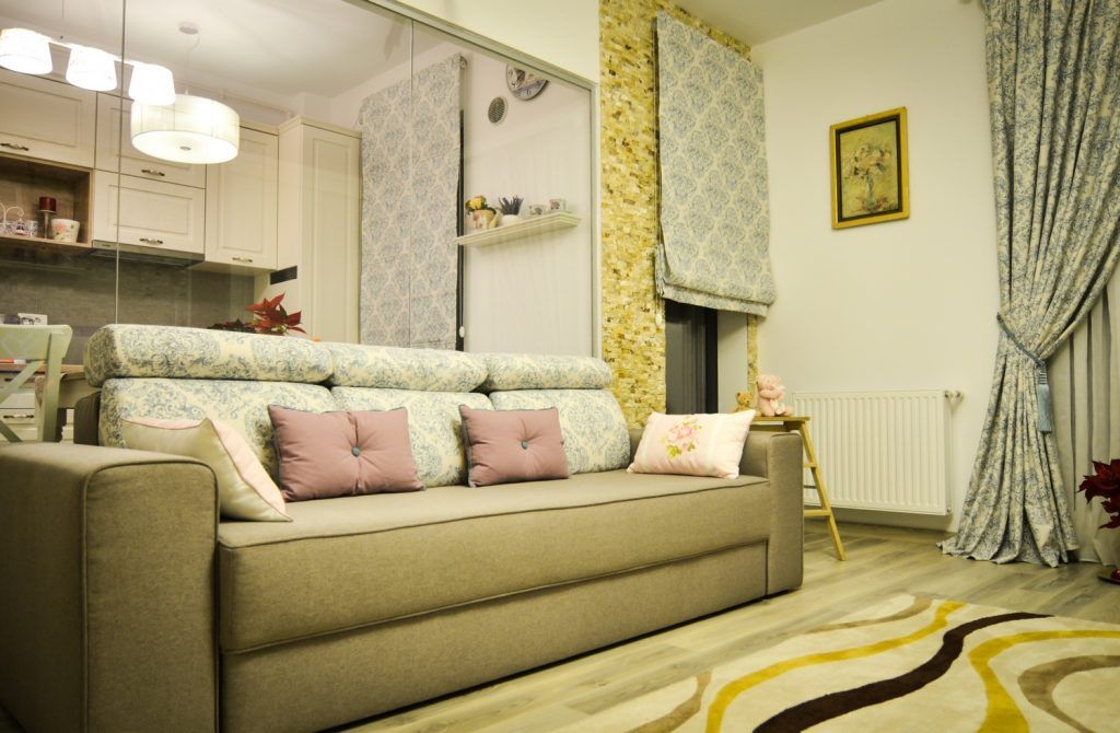“La nivelul finisajelor si materialelor am mizat pe culori deschise, pe imprimeuri astfel incat sa spargem gama de griuri regasita initial in garsoniera”, continua fetele de la Atelierul de Idei. Din acelasi considerent de a colora si incalzi atmosfera am intervenit in zona de living si hol cu o placare cu piatra naturala.” Efectul per ansamblu este Wow! Nu te astepti ca o piatra perceputa ca rece sa transmita o senzatie placuta vizual, de caldura. In acelasi timp, prin placarea cu piatra se contureaza zone de accent binevenite in cadrul amenajarii.