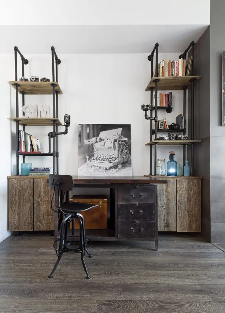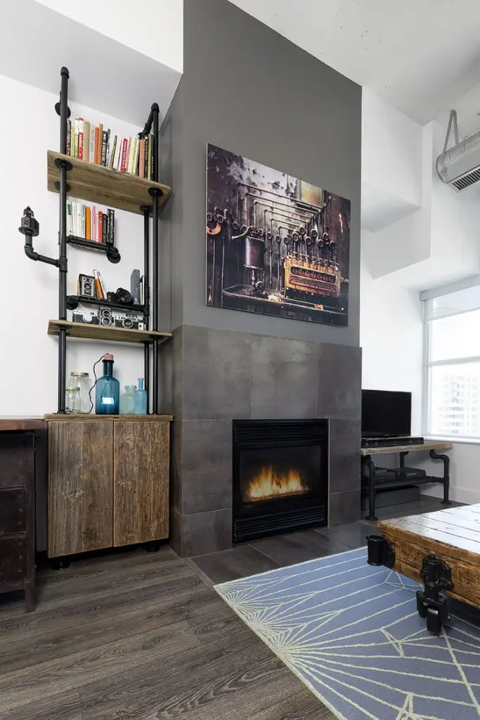 Semineul este pur ornametal, acesta da o nota de caldura si un aer familial intregului spatiu de locuit. Conductele din care sunt construite rafturile dau un "vibe" industrial amenajarii. Aceste rafturi sunt ocupate cu colectiile de camere foto vintage, albume de fotografie si carti.