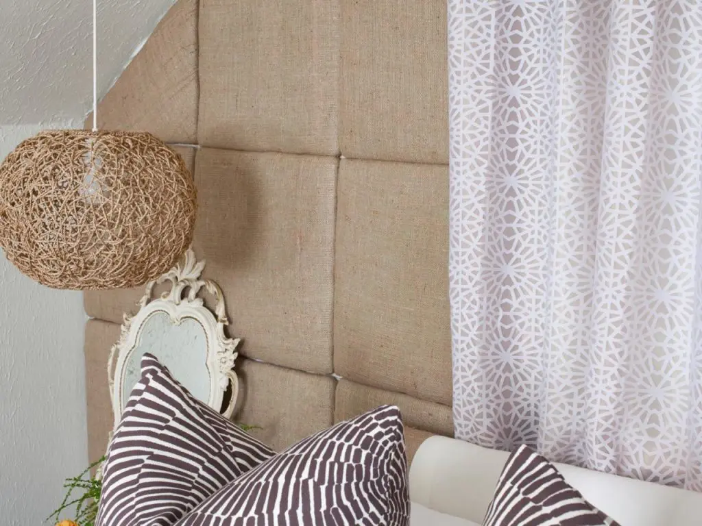 Stilul se continua si in dormitor cu texturi de canepa si in. Decorul s-a facut cu regula numerelor impare, pastrandu-se simplitatea si tonurile calde. Fereastra mica este scoasa in evidenta prin tapiteria din iuta de pe perete. Lampa este coborata la livelul mobilierul pentru a crea spatiu si unitate.