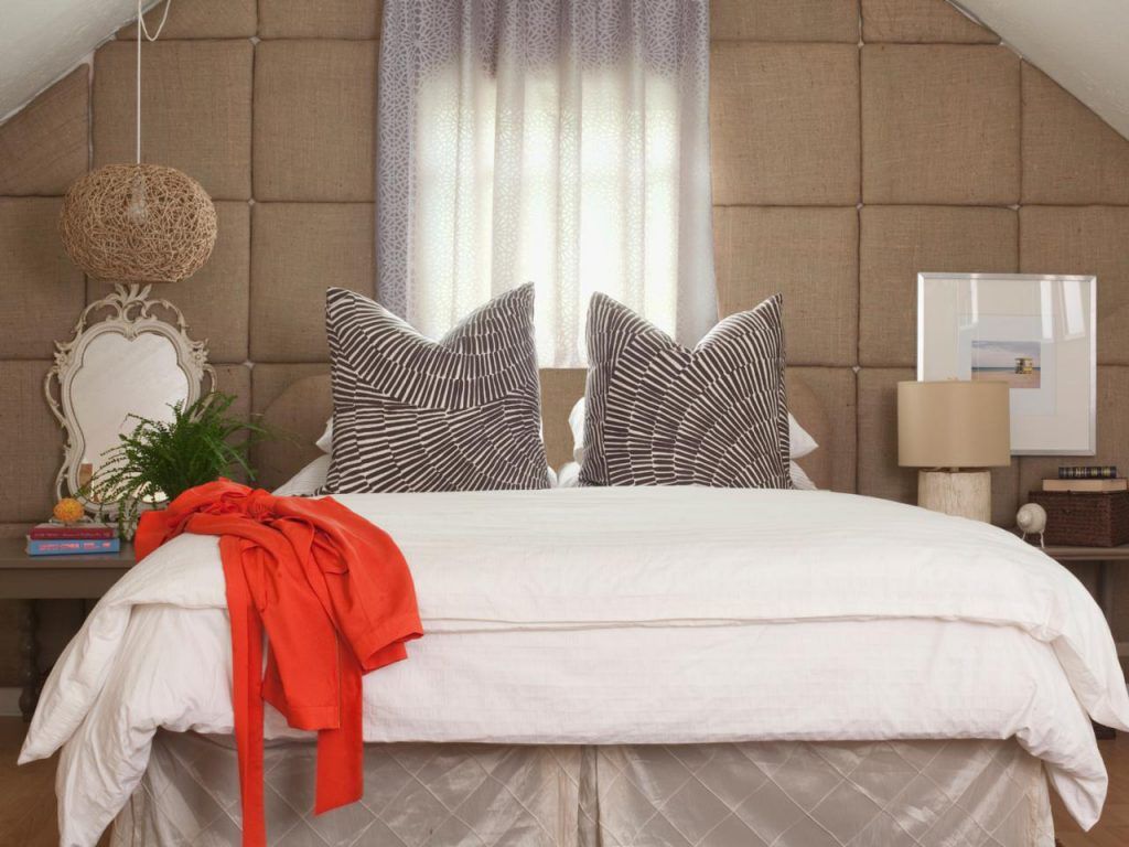 Stilul se continua si in dormitor cu texturi de canepa si in. Decorul s-a facut cu regula numerelor impare, pastrandu-se simplitatea si tonurile calde. Fereastra mica este scoasa in evidenta prin tapiteria din iuta de pe perete. Lampa este coborata la livelul mobilierul pentru a crea spatiu si unitate.