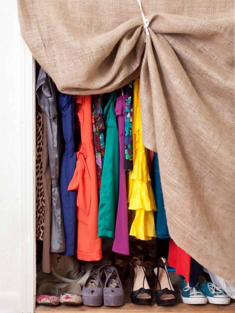 Pentru depozitare, s-a renuntat la mobila masiva care ar fi ocupat mult spatiu. Bara de umerase si raftul pentru incaltaminte sunt ascunse dupa o perdea din iuta. Pe langa acest dressing improvizat, exista un corp compartimentat in care sunt asezate cosuri pentru depozitare.