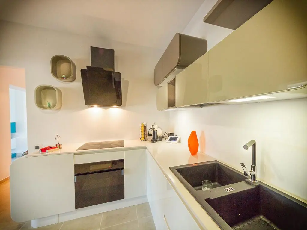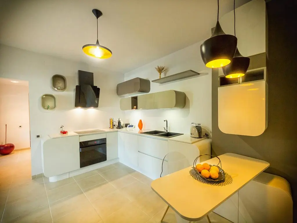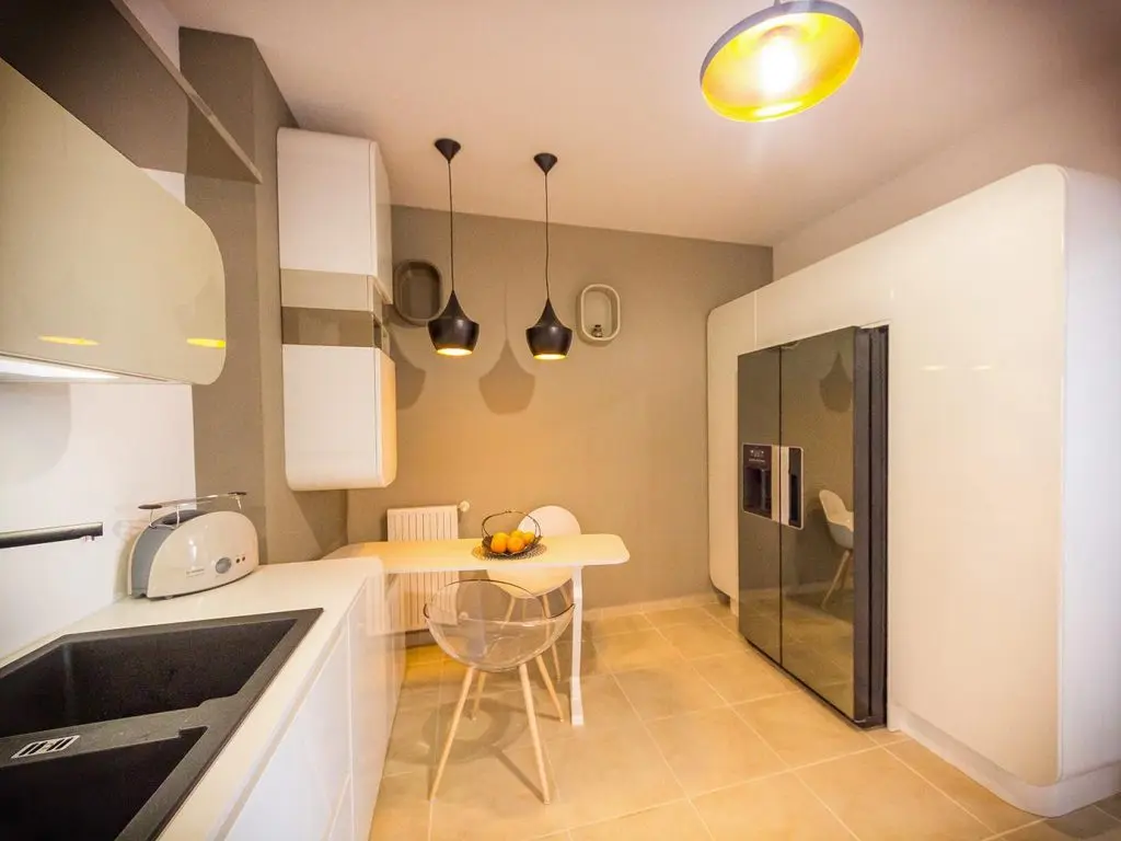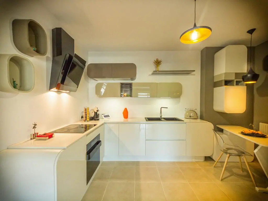 In bucatarie, nuantele neutre sunt imbinate cu cele de accent. Mobila este lucioasa, cu forme rotunjite, intr-un joc de nuante de bej. Astfel, s-a continuat ideea unei amenajari moderne. Si aici s-au ales mai multe surse de lumina, ceea ce confera un plus de spatialitate incaperii.