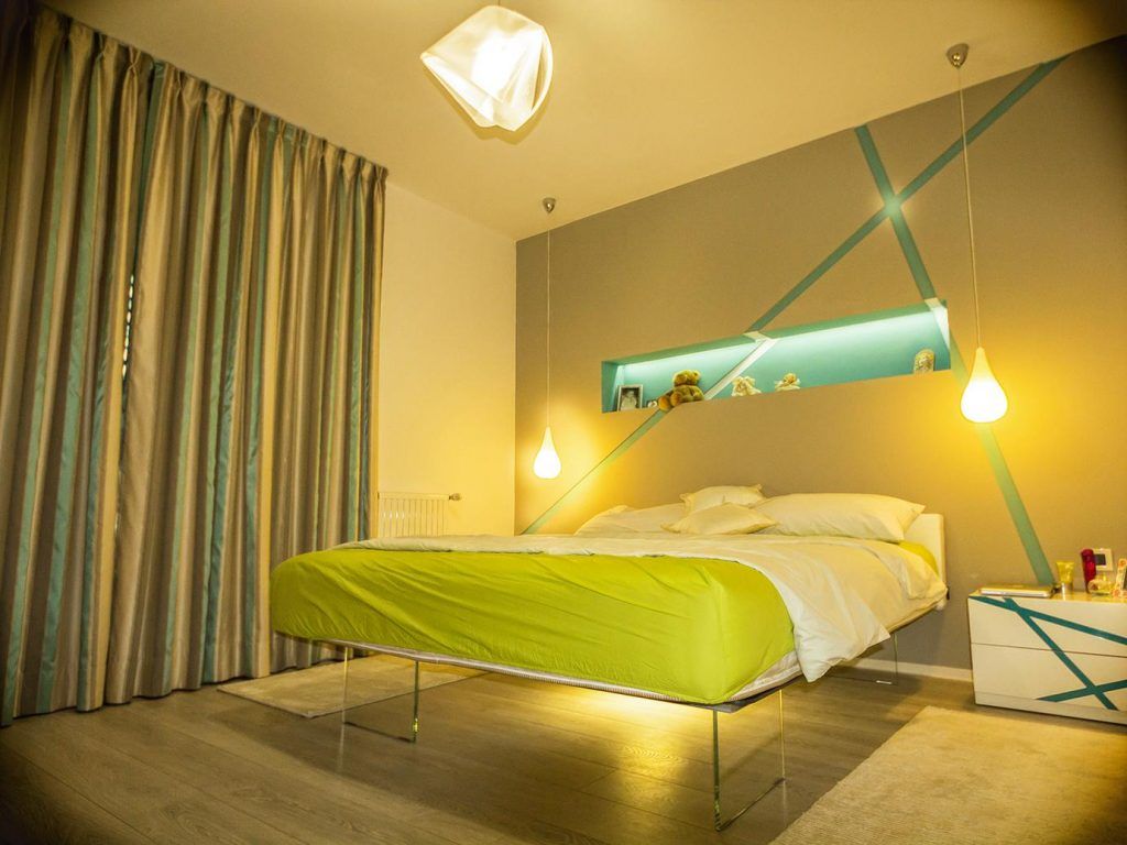 In dormitor, se continua elementele geometrice, de aceasta data, sub forma unor dungi turcoaz dispuse neregulat pe perete si mobilier. Dinamica incaperii este data si de alegerea mai multor surse de lumina: lustra din tavan, care ofera o lumina generala, si lampile din zona de dormit care coboara din tavan pana aproape de nivelul patului.