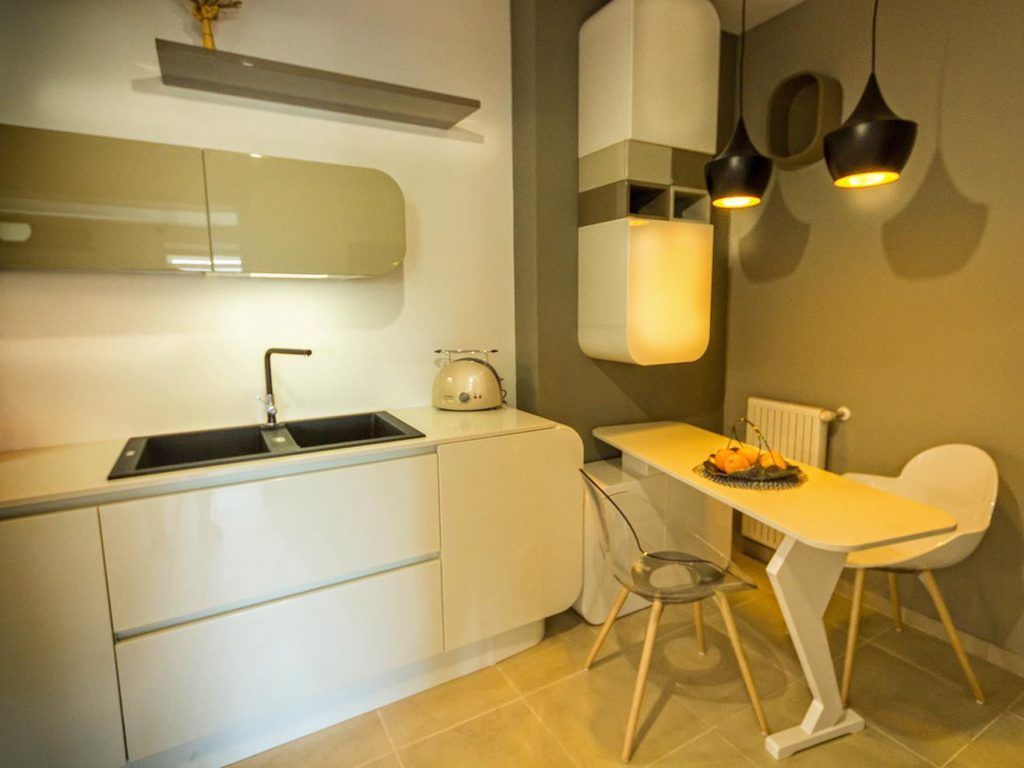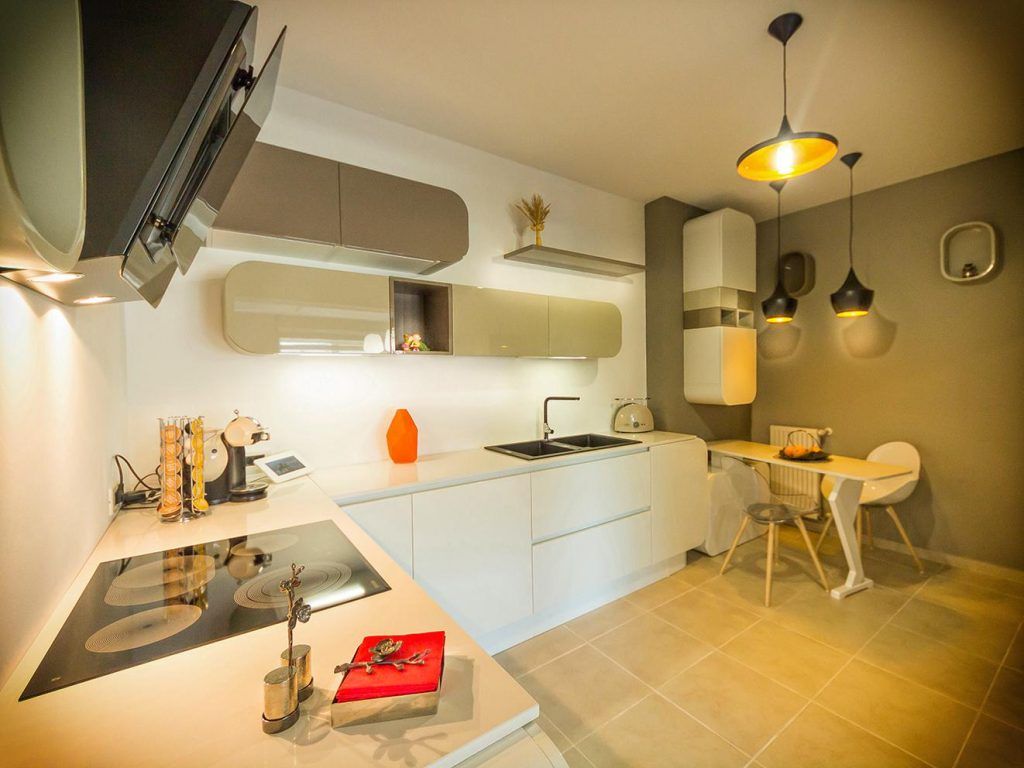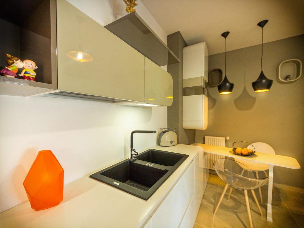 In bucatarie, nuantele neutre sunt imbinate cu cele de accent. Mobila este lucioasa, cu forme rotunjite, intr-un joc de nuante de bej. Astfel, s-a continuat ideea unei amenajari moderne. Si aici s-au ales mai multe surse de lumina, ceea ce confera un plus de spatialitate incaperii.