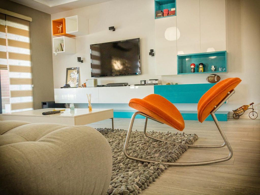 Livingul comunica vizual cu bucataria care este semideschisa. In centrul incaperii troneaza o canapea in forma de L moderna si in acelasi timp confortabila. Aceasta este, fara indoiala, centrul de interes al camerei. Atentia este captata si de pernele decorative care au rolul de culoare-accent. Astfel, zona de relaxare este marcata vizual prin culoarea oranj, pe care o regasim la scaunul de langa canapea.
