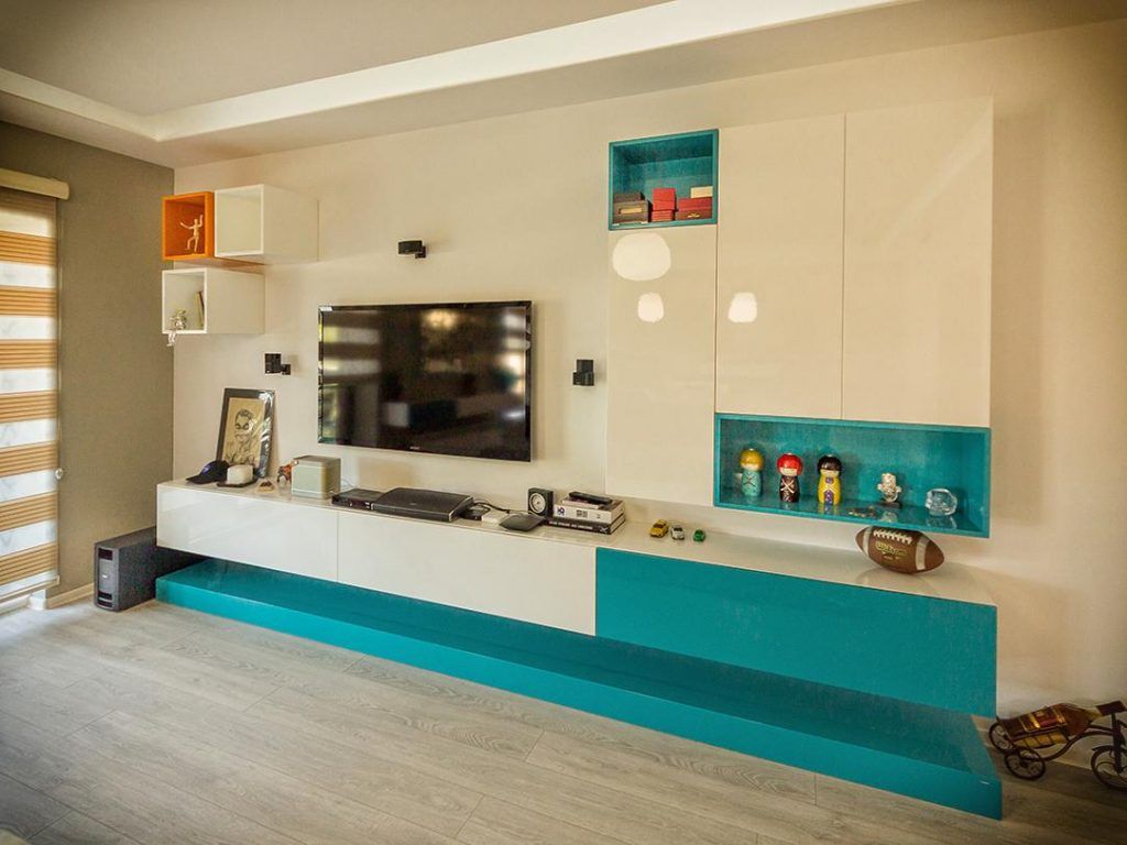 S-a optat pentru o masuta de cafea simpla, alba, ce vine in completarea raftului din perete. Livingul este delimitat vizual de zona de dining printr-un plafon fals, care este separat in cele doua incaperi. De asemenea, cele doua zone sunt luminate separat, iar diningul este marcat vizual de culoarea-accent turcoaz.