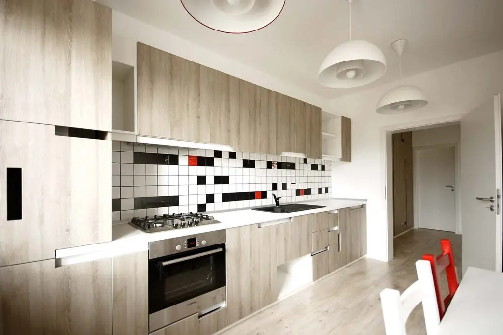 In bucatarie, mobilierul are o trasatura minimalista, prin liniile geometrice clar definite si sistemul de inchidere/deschidere al usilor. Astfel, clasicele manere au fost inlocuite cu decupaje dreptunghiulare ale usilor, dispuse diferit.