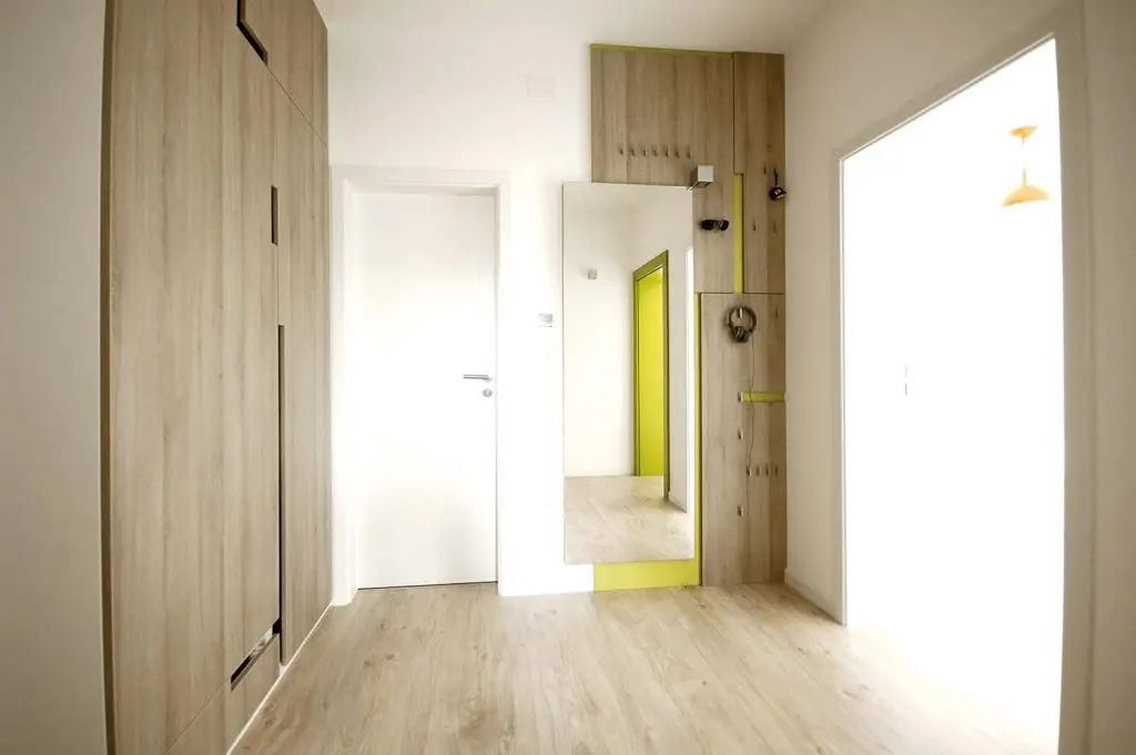 Trecerea dintre incaperi este marcata printr-un accent de culoare, asa cum este cea verde spre living. De asemenea, culoarea rosie este folosita in bucatarie pentru a marca principalele zone.