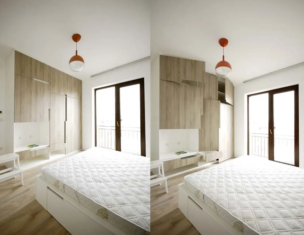 Acelasi stil se continua si in dormitor, unde suprafetele superioare si laterale ale mobilierului, inclusiv ale patului, sunt albe, cu scopul de a fuziona cu peretii. De asemenea, se regaseste culoarea-accent rosu, marcata pe lustra.