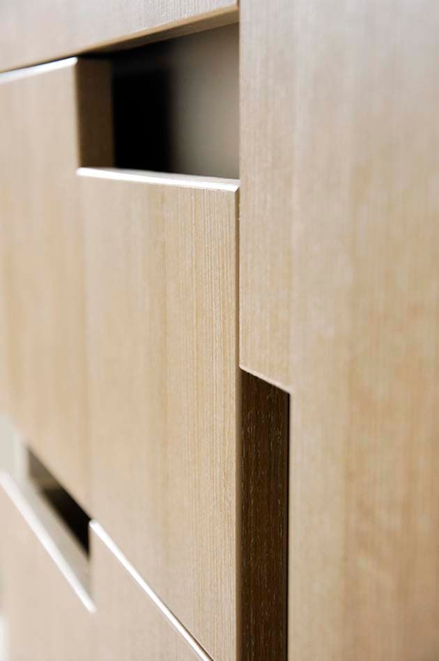 In bucatarie, mobilierul are o trasatura minimalista, prin liniile geometrice clar definite si sistemul de inchidere/deschidere al usilor. Astfel, clasicele manere au fost inlocuite cu decupaje dreptunghiulare ale usilor, dispuse diferit.