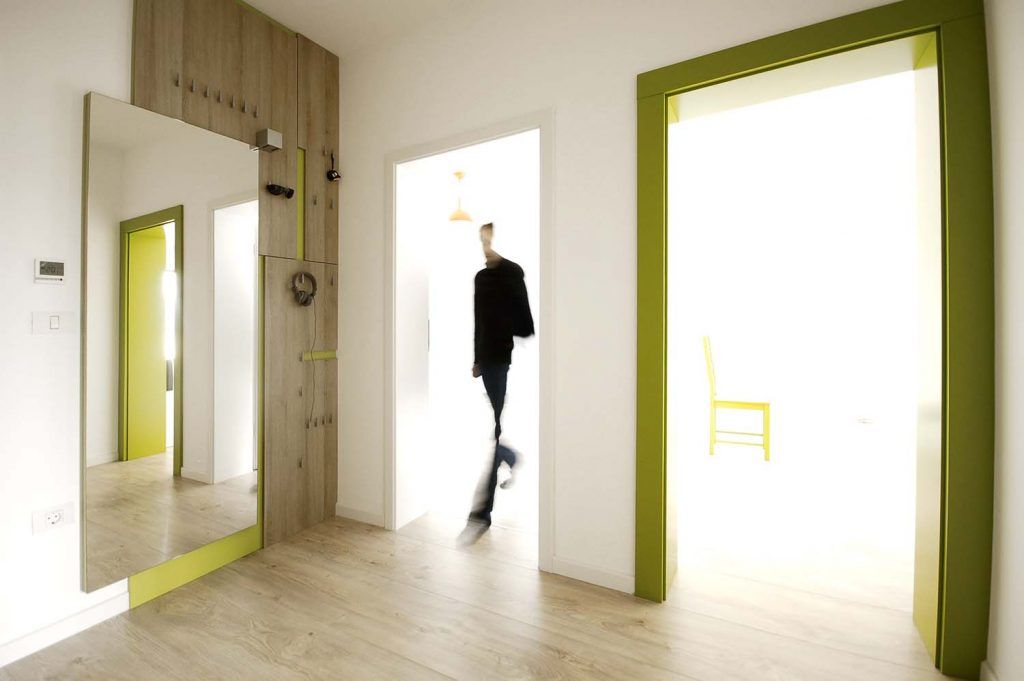 Trecerea dintre incaperi este marcata printr-un accent de culoare, asa cum este cea verde spre living. De asemenea, culoarea rosie este folosita in bucatarie pentru a marca principalele zone.