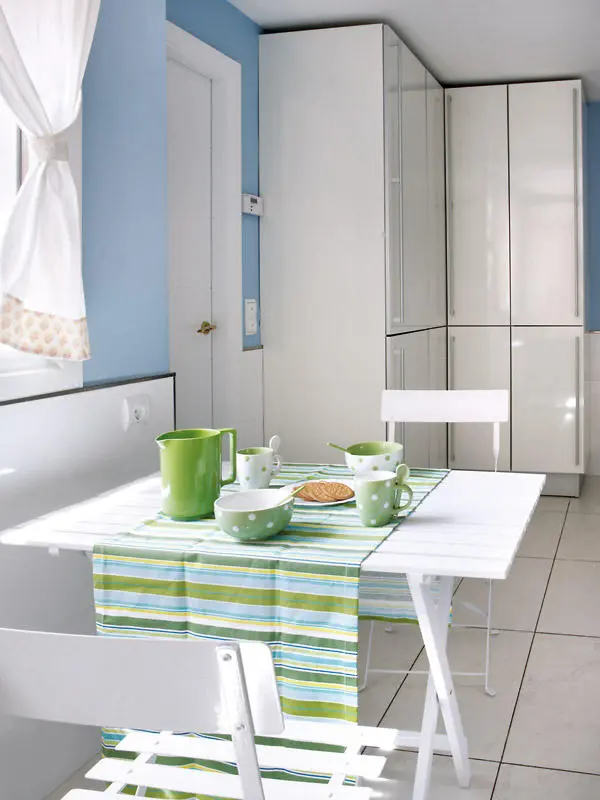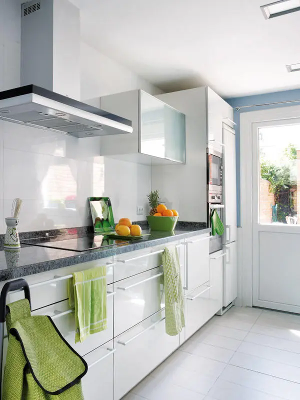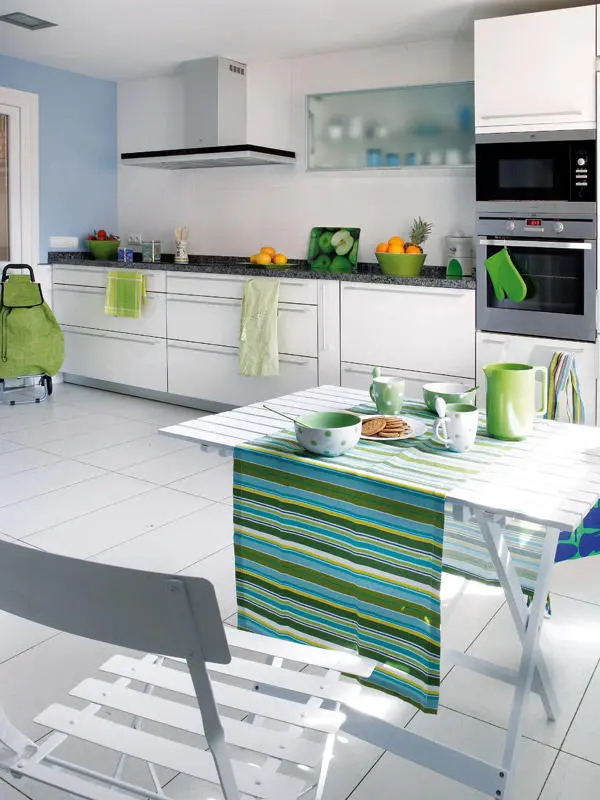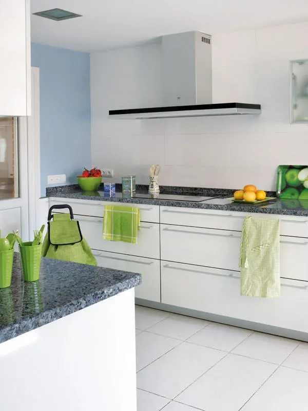 Dispunerea paralela a bucatariei permite o mai buna functionalitate, iar mobilierul modern cu linii simple si suprafete netede asigura o estetica placuta. Adaugam aici si blatul de lucru din granit compozit care contrasteaza cu albul decorului precum si electrocasnicele incastrate in cadrul mobilierului, cu exceptia hotei. Masa cu scaunele, toate albe, asezate in dreptul ferestrei completeaza armonios acest ambient curat prin linii si finisaje. Accentele de verde ale accesoriilor aduc o nota de prospetime camerei si asigura o cromatica potrivita unui spatiu pentru gatit alaturi de albul si bleul mai sus mentionate.