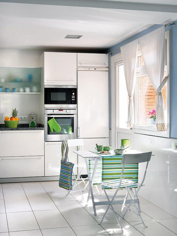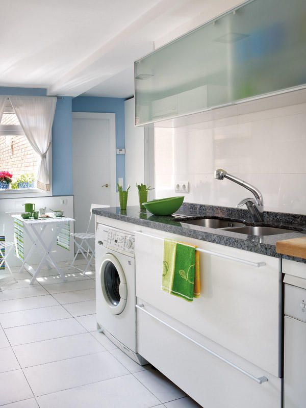 Dispunerea paralela a bucatariei permite o mai buna functionalitate, iar mobilierul modern cu linii simple si suprafete netede asigura o estetica placuta. Adaugam aici si blatul de lucru din granit compozit care contrasteaza cu albul decorului precum si electrocasnicele incastrate in cadrul mobilierului, cu exceptia hotei. Masa cu scaunele, toate albe, asezate in dreptul ferestrei completeaza armonios acest ambient curat prin linii si finisaje. Accentele de verde ale accesoriilor aduc o nota de prospetime camerei si asigura o cromatica potrivita unui spatiu pentru gatit alaturi de albul si bleul mai sus mentionate.