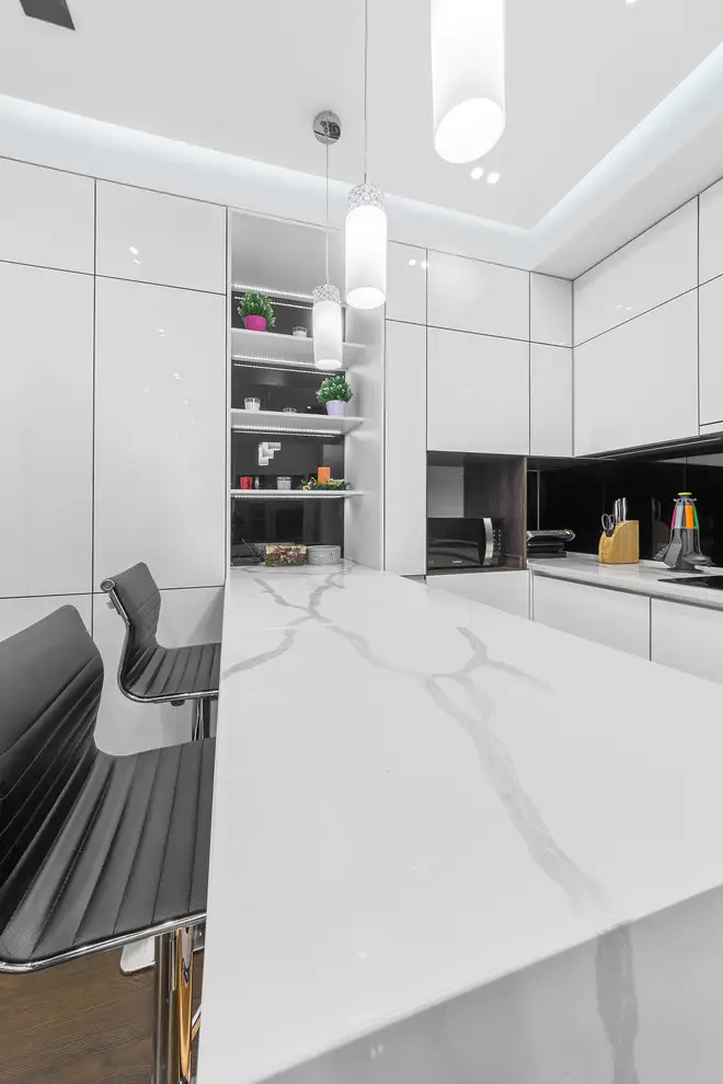 Zonele de lucru ofera suficient spatiu pentru prepararea mancarii, iar insula din marmura dispune de spatiu aditional atat pentru gatit, cat si pentru servirea mesei. Electrocasnicele sunt incorporate in mobilier, iar frigiderul de mari dimensiuni cu doua usi, functioneaza ca o oglinda.