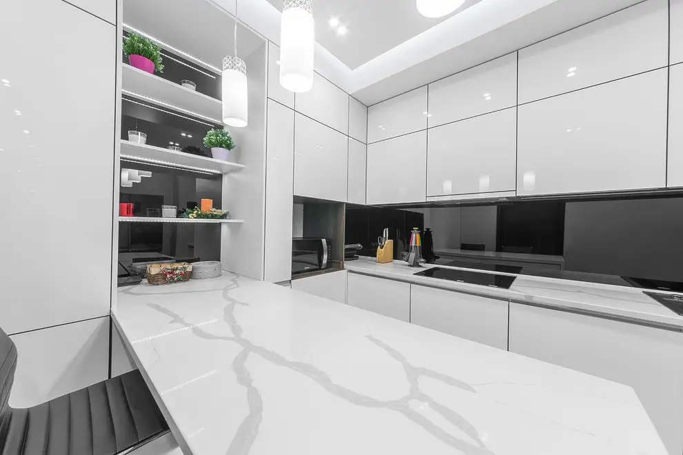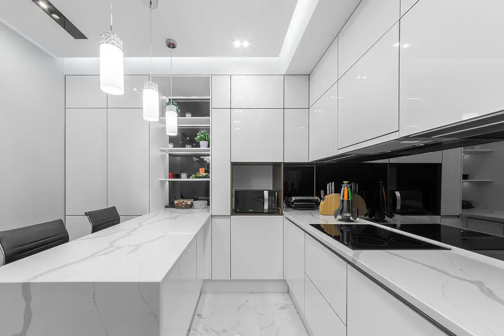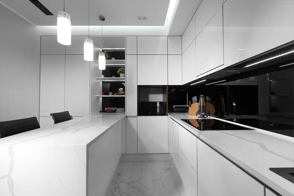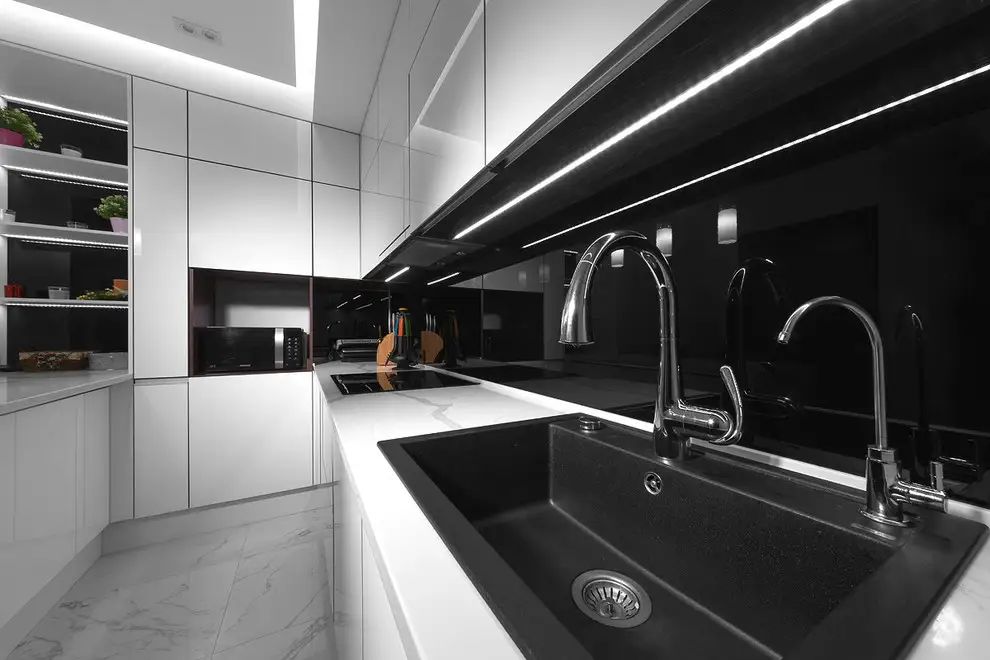 Pentru astazi am ales sa iti prezentam o bucatarie ultramoderna, amenajata in anul 2018, de care ne-am indragostit pe loc! Contrastul alb-negru reprezinta baza cromatica a amenajarii, iar fronturile din M DF alb lucios reflecta lumina si mareste vizual spatiul bucatariei.