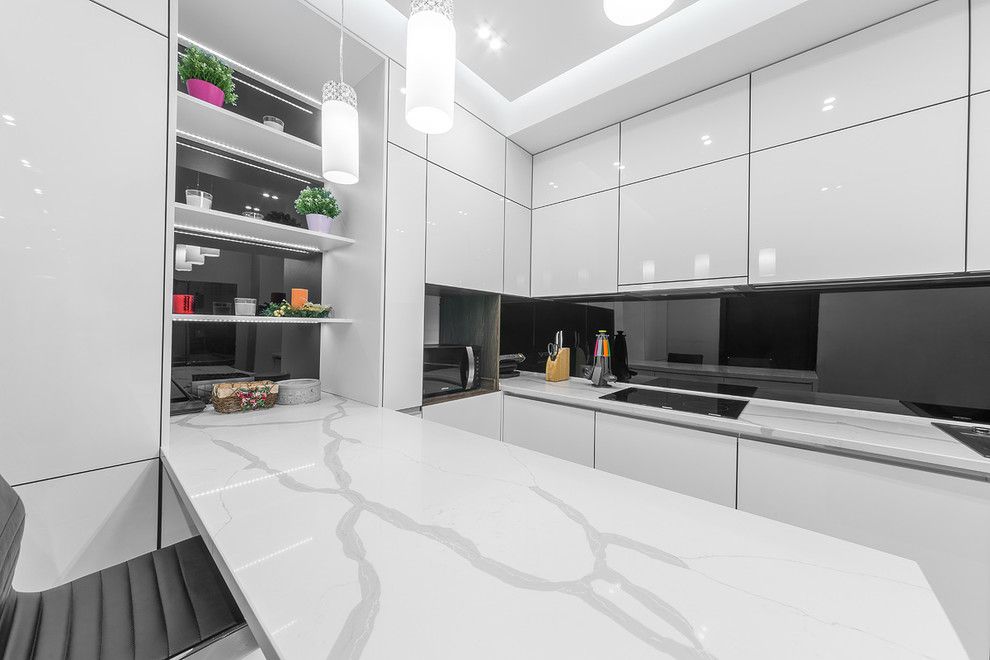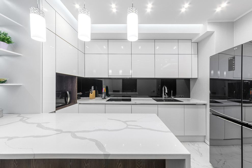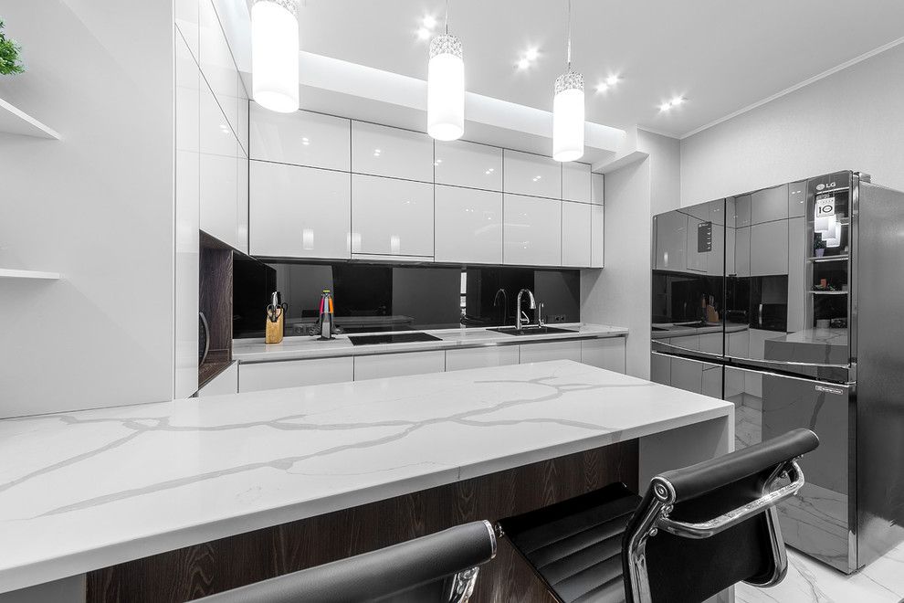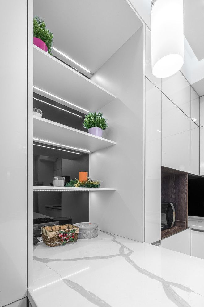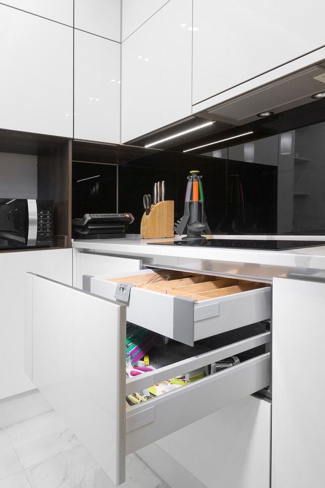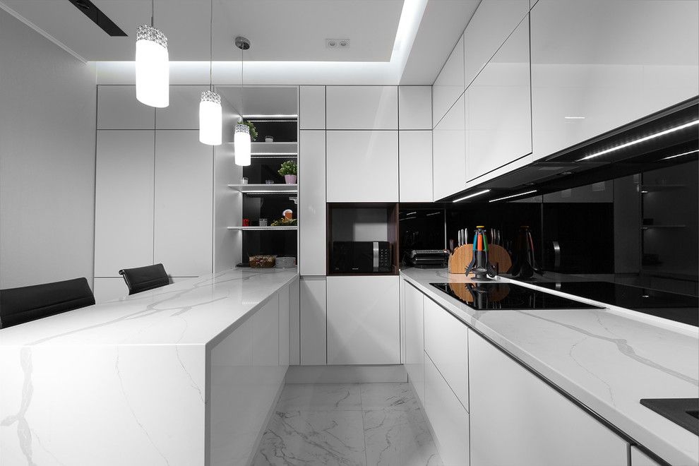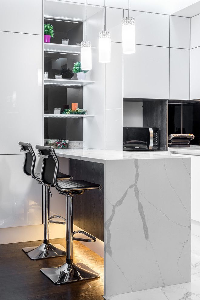 Pentru astazi am ales sa iti prezentam o bucatarie ultramoderna, amenajata in anul 2018, de care ne-am indragostit pe loc! Contrastul alb-negru reprezinta baza cromatica a amenajarii, iar fronturile din M DF alb lucios reflecta lumina si mareste vizual spatiul bucatariei.