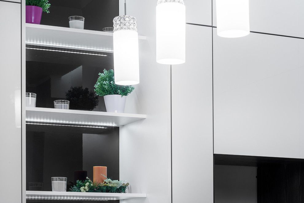 Corpurile de mobilier, atat cele principale, cat si cele suspendate, acopera aproape integral peretii, oferind multiple spatii de depozitare.
