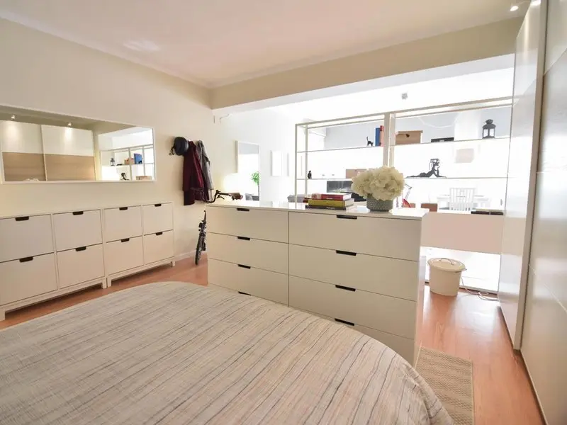 O biblioteca deschisa delimiteaza zona de zi de cea destinata dormitorului. Acestuia i-a fost adaugata o masa pentru lucru, insa spatiul ramane generos si functional.