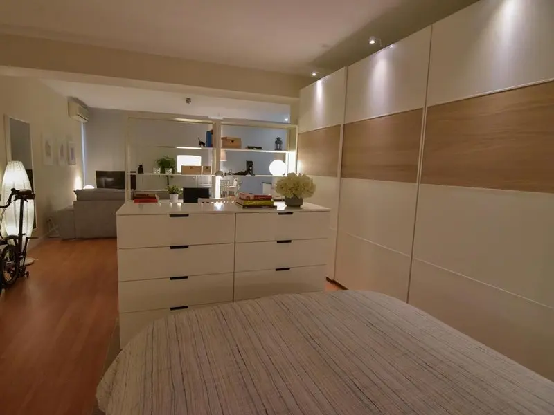 Spatiul pentru depozitare este suficient, in ciuda faptului ca ne aflam intr-un studio de 50 mp. Dulapurile si sertarele au fost amplasate atat pe pereti, cat si in mijlocul camerei, realizand astfel un paravan intre mai multe zone functionale ale studioului.