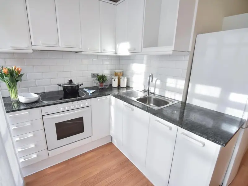 Structura bucatariei sub forma literei L integreaza zona de luat masa printr-un mobilier extensibil care poate gazdui cu succes o masa in familie.
