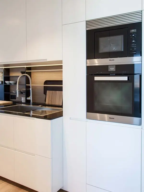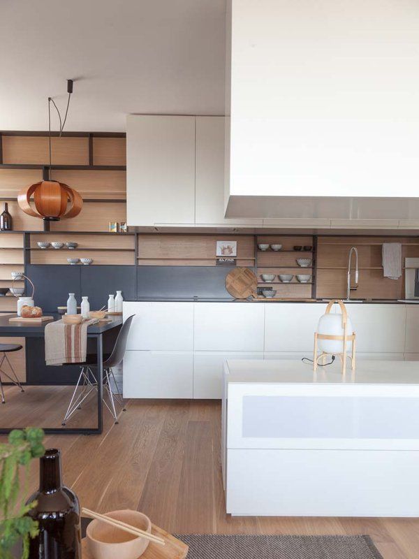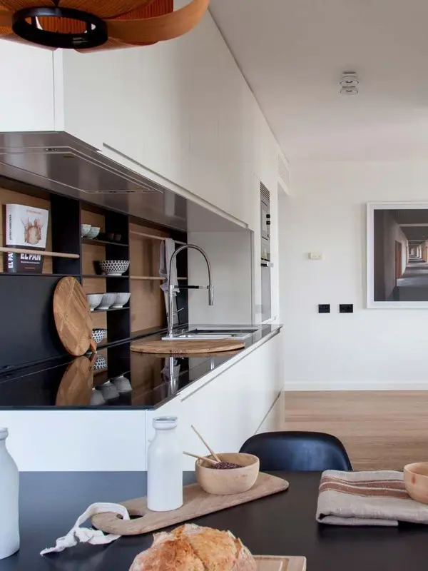 Suprafetele netede, lucioase, contrastul alb-negru ne reamintesc ca ne aflam intr-o bucatarie contemporana, minimalista, cu design care se contreaza pe forme si linii si pe impactul pe care il creeaza in ansamblu open space-ului. Lemnul pardoselii si albul mobilierului ofera un ambient cald, echilibrat.
