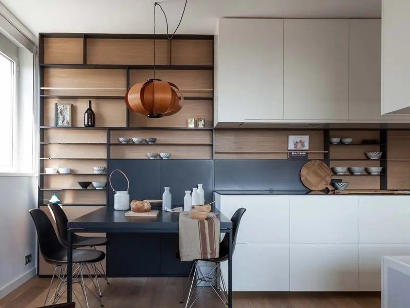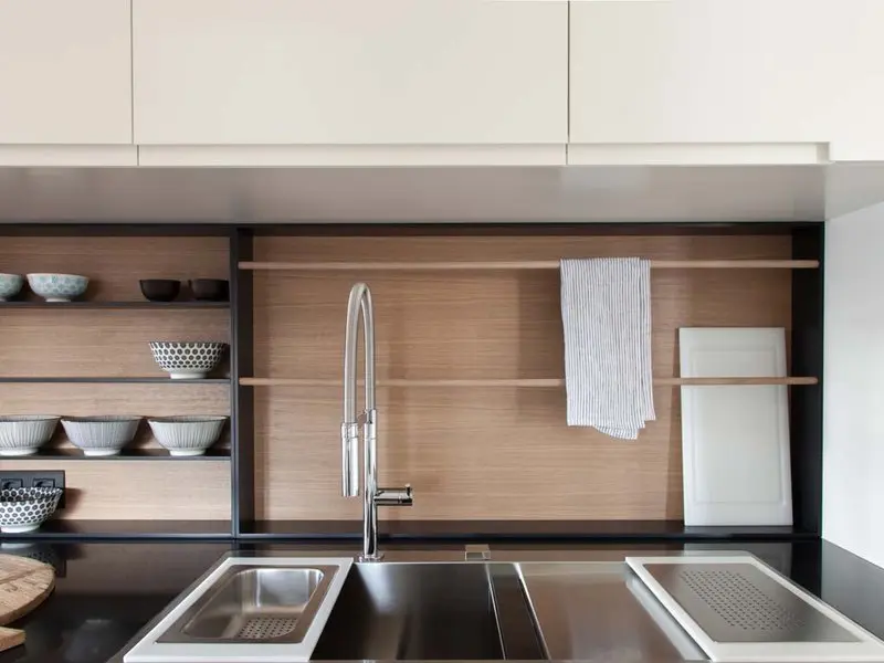 Designul bucatariei cu linii simple si cu aspect cald, placut se integreaza minunat in spatiul pe care il imparte cu livingul si diningul.