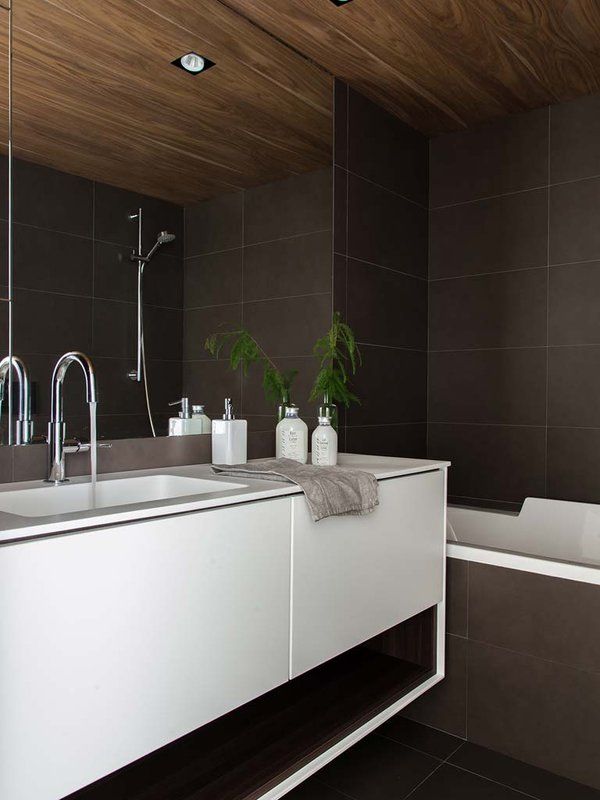 Placile ceramice mate de un gri inchis, lavoarul alb si lemnul cu care tavanul este placat, compun un spatiu minimalist, foarte elegant si bine accesorizat.