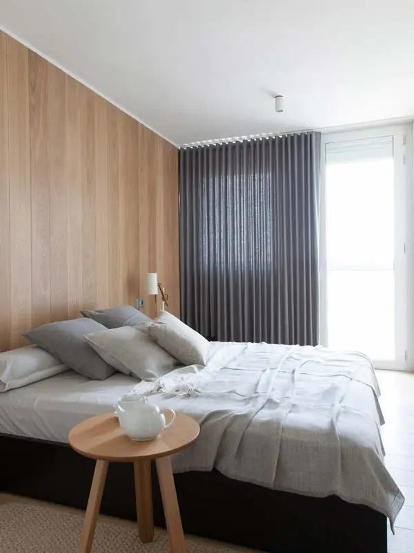 Dormitorul pastreaza aceeasi linie contemporana, a tuselor cromatice blande, nuantele naturale ale furnirului de stejar.