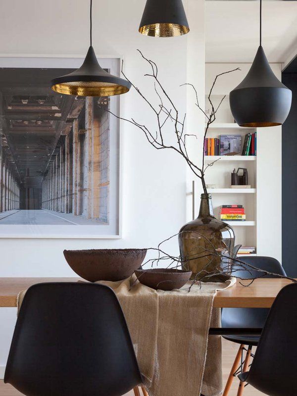 Corpuri de iluminat Tom Dixon si accente decorative contemporane: decoratiunile de pe masa si tabloul. Efectul optic este deosebit