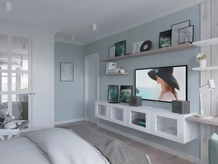 Dulapul de haine cu oglinzi este sursa principala de depozitare, iar rafturile si etajerele joaca un rol decorativ fiind folosite pentru carti, tablouri sau alte mici decoratiuni. Tot aici a fost amenajata si o zona de lucru, marcata prin placarea unei portiuni din perete cu placi laminate.