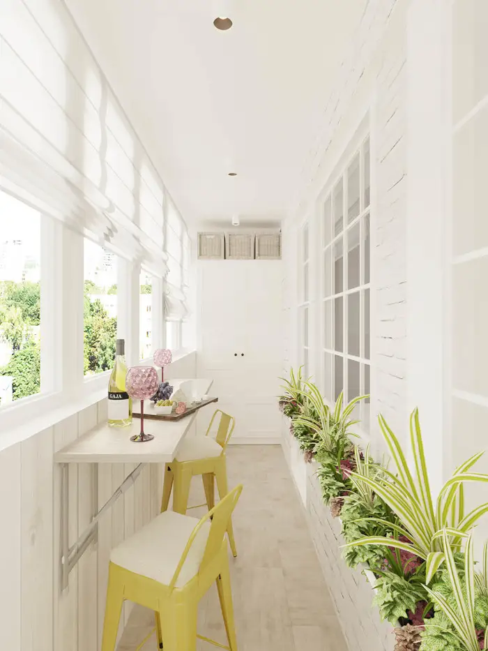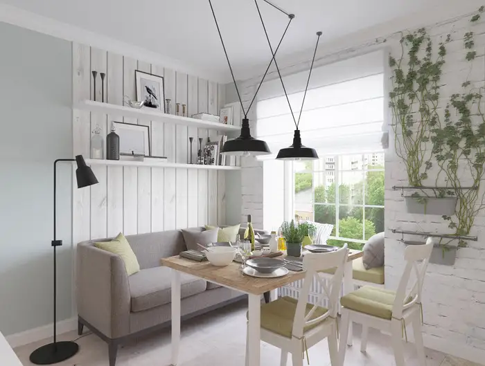 Mergand spre zona de zi, regasim acelasi efect de caramida aparenta si placare cu placi de laminat in spatiul care cuprinde locul de luat masa si o sofa, ba chiar si un loc de relaxare amenajat la fereastra. Exista chiar si un televizor integrat in amenajare si o mini-consola pe un perete pe care l-am putea numi ca o zona de accent sau de interes pentru cei din incapere.
