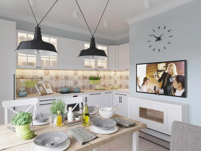 In continuarea acestui spatiu se afla amenajata zona de gatit cu mobilier compact si electrocasnice incastrate pentru o unitate vizuala. Placile ceramice in stil patchwork dintre corpurile de mobilier vin sa aduca un plus de dinamica amenajarii.