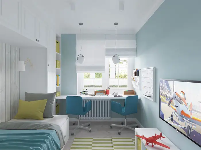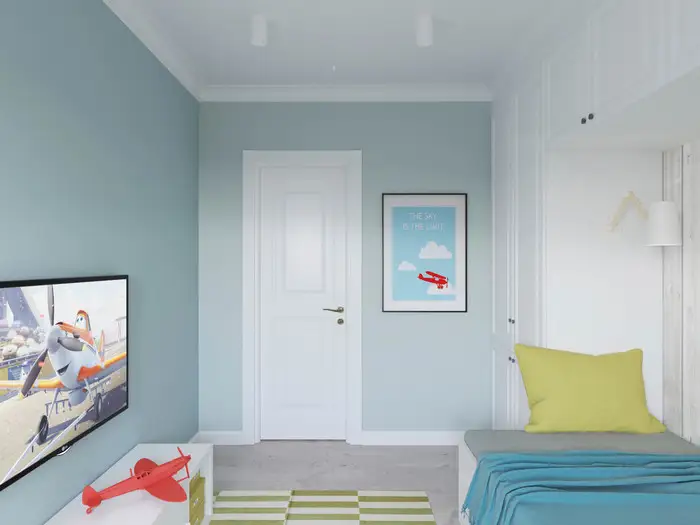Si in camera copilului regasim aceleasi nuante utilizate in intreaga amenajare a apartamentului. Alb si turcoaz cu insertii de verde pentru un aspect fresh, dinamic si aerisit al camerei. In jurul patului copilului au fost amenajate dulapuri si rafturi deschise pentru o depozitare diversa. La fereastra, blatul tine loc de birou.