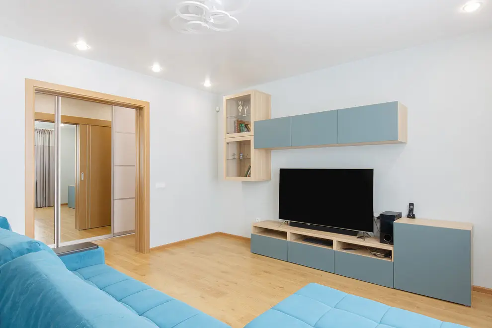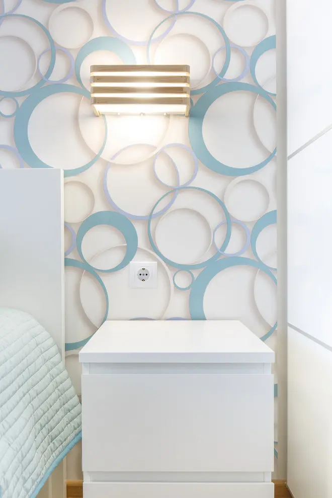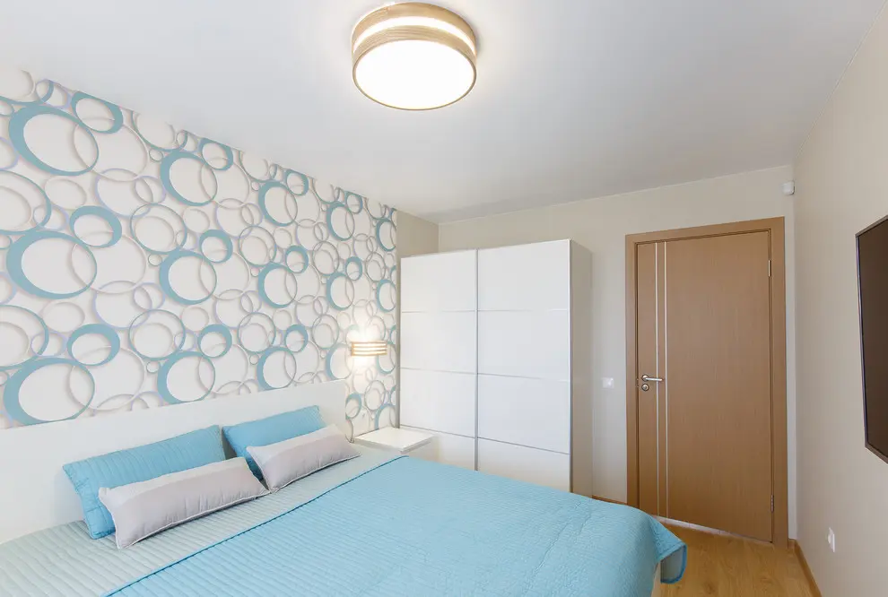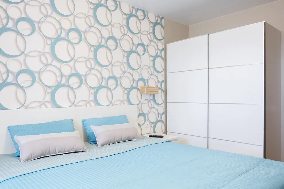 Dormitorul place in mod deosebit prin acel tapet care scoate intreaga camera din monotonie. Accentele de bleu-ciel se armonizeaza cu tonurile neutre predominante creand un ambient relaxant si confortabil potrivit unui dormitor.