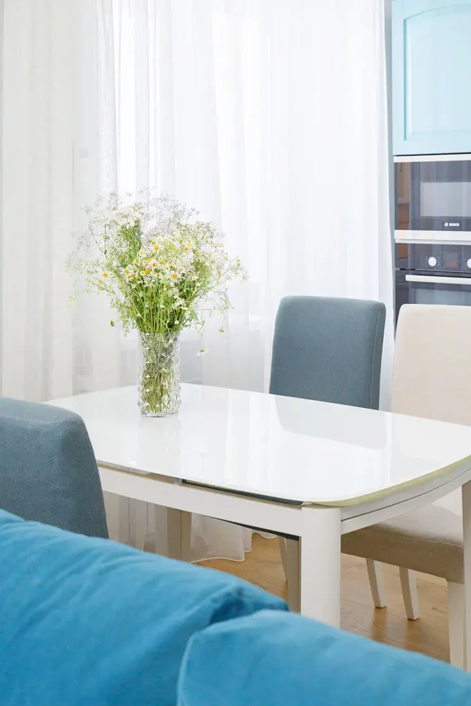 Ferestrele mari permit o cantitate mare de lumina naturala, iar albul predominant sporeste efectul de spatialitate. Albastrul pastel e motivul cromatic care predomina in acest spatiu, oferind un accent de culoare placut integrat in contextul general. Acelasi albastru il vom regasi si la nivelul bucatariei, mai exact pe frontul dulapurilor principale.
