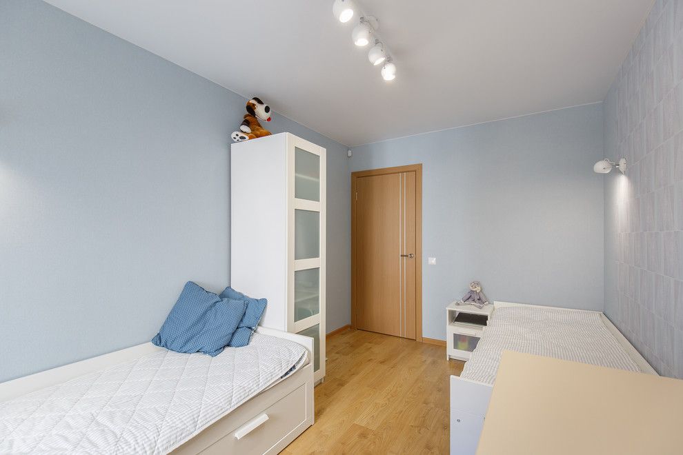 Dormitorul place in mod deosebit prin acel tapet care scoate intreaga camera din monotonie. Accentele de bleu-ciel se armonizeaza cu tonurile neutre predominante creand un ambient relaxant si confortabil potrivit unui dormitor.