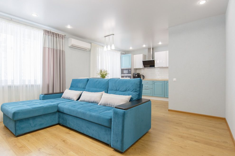 Una din cele mai importante modificari efectuate in acest apartament a fost eliminarea peretelui care separa bucataria de living. Astfel, s-a obtinut o zona de zi unitara, mai luminoasa si mai spatioasa, cu un loc pentru luat masa care separa vizual cele doua functiuni.